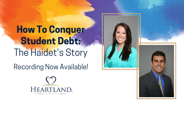 Join Heartland Dental-supported doctors Drew and Whitney Haidet for their webinar, “How to Conquer Student Loan Debt: The Haidets’ Story,” as they discuss how they paid off their dental student debt in a little over two years after graduation. They also will give the audience tips on what they can be doing now to save for the future.